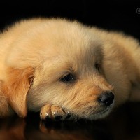 retriever puppy lying down. It appears to be resting or possibly asleep, with its eyes closed and paws relaxed. The puppy has a soft,