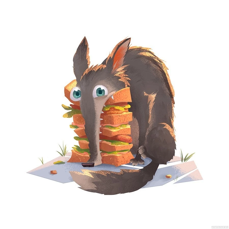 The image shows an illustration of a wolf-like creature with a somewhat exaggerated or anthropomorphic appearance, such as wearing clothes or having human-like expressions. It is depicted sitting down and eating multiple sandwiches stacked on top of each other. The creature's eyes are wide open in a surprised or excited expression, suggesting that it might be really enjoying the meal. This kind of image is often created for