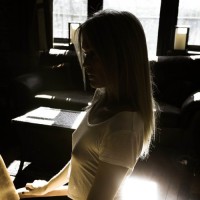 blonde hair and is wearing what appears to be a tight-fitting top or leotard. The lighting in the room suggests it might be