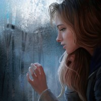 The image features a girl with blonde hair, looking out of a window. She appears to be in thought or contemplation, as her gaze is directed outside and she has a soft expression on her face. The setting seems to be indoors, possibly in the evening given the darkened atmosphere outside the window.