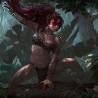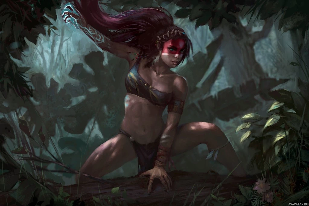 a young woman with wavy hair and wearing a green top and leggings. She has a tribal look with body paint on her arms and legs and is holding what seems to be
