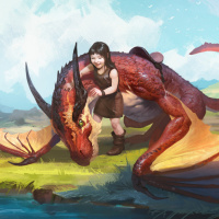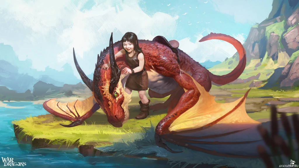 a body of water given the presence of what looks like rocks or cliffs in the background and the grassy area surrounding them. The dragon is shown as friendly, bending its neck down towards the child who is holding onto it. This scene captures the essence of fantasy genres where