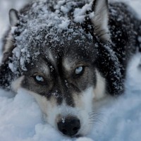 На картине изображена собака, в частности, волк или волчья собака. Кажется, что он лежит в снегу, а его лицо частично покрыто снегом. Это изображение может указывать на холодную и зимнюю среду, где это животное отдыхает или исследует свое окружение.