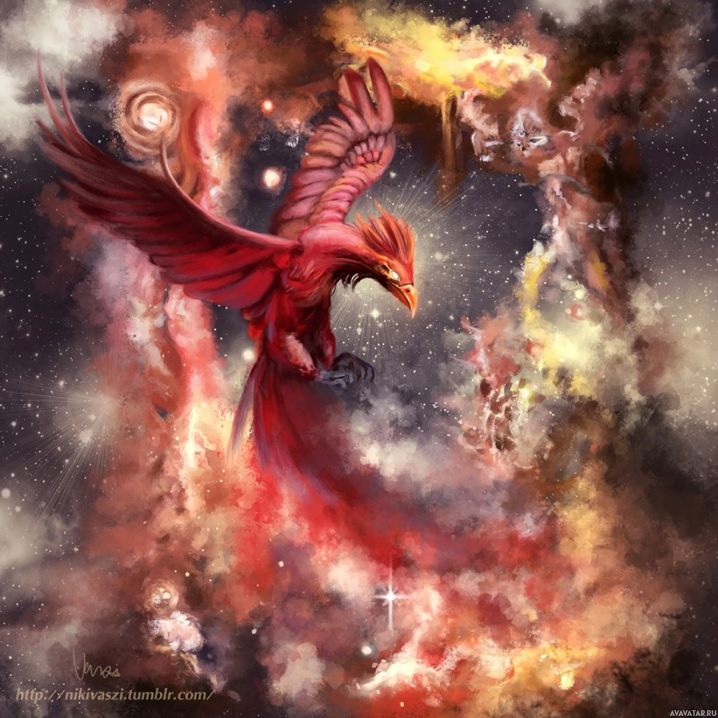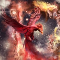 the night sky filled with stars and celestial bodies such as planets and nebulas, suggesting a cosmic setting. This image combines elements of fantasy, possibly representing fire or rebirth symbolism often associated with