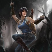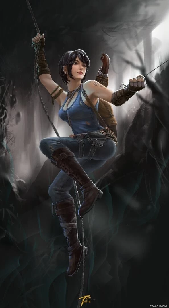 a utility belt. She's holding onto a rope that could be part of her equipment for climbing or navigating obstacles. The background is dark and ominous, with twisted tree roots or vines, indicating a jungle or