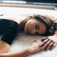 На снимке изображена женщина, лежащая на животе на кровати. Она носит черный верх и, кажется, смотрит в сторону от камеры. Обстановка, по-видимому, является внутренней средой, вероятно, спальней или гостиничным номером, учитывая наличие кровати.