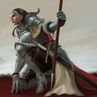 a female warrior or knight in armor, with a long skirt that flows down from the waist. She is wearing