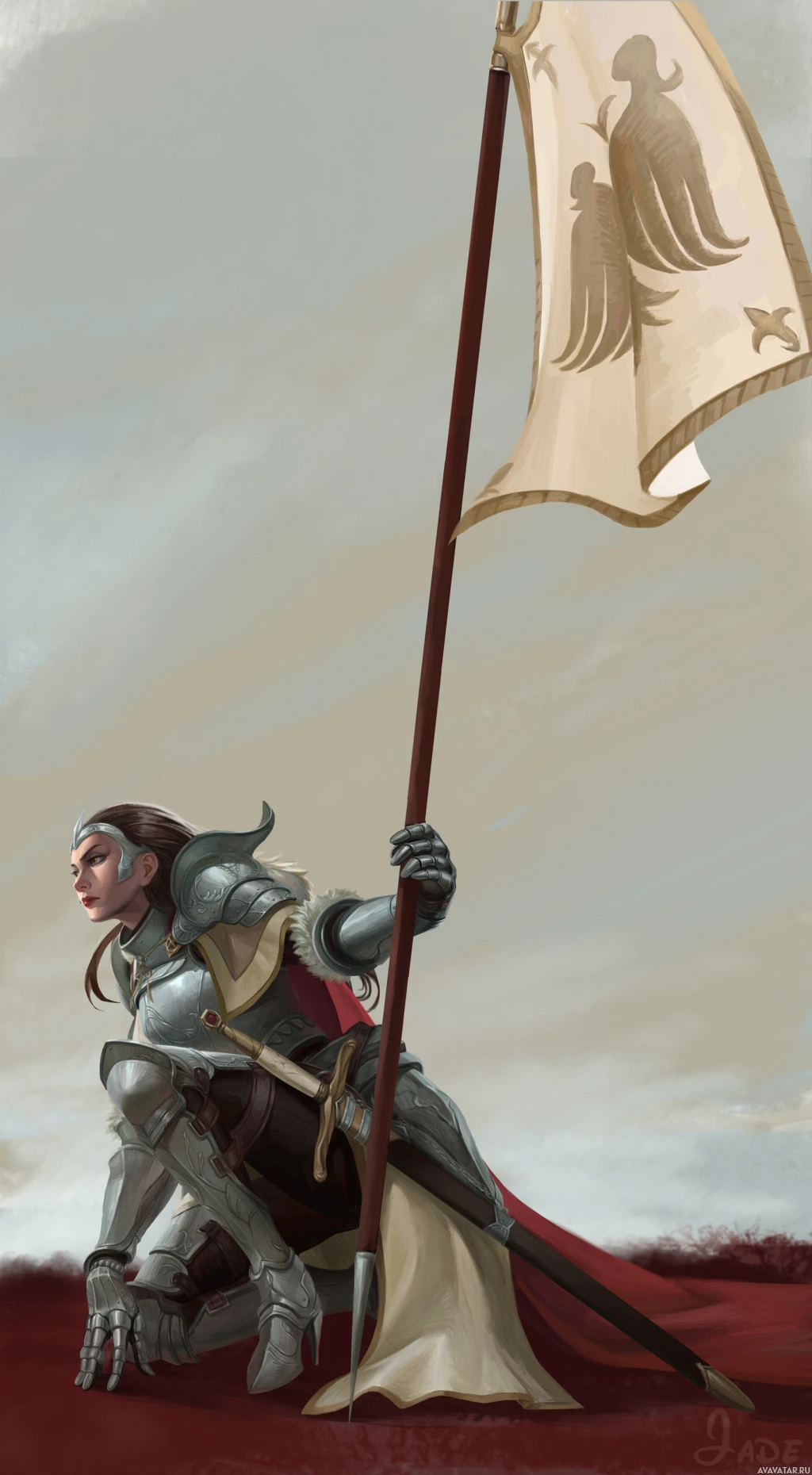 a golden eagle emblazoned on it, while the other flag features a cross. The setting appears to be a battlefield or war zone, suggested by the red, rocky ground beneath her and the overcast