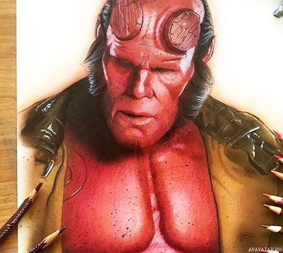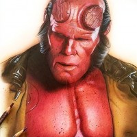The image depicts a drawing or painting of a character known as Hellboy. He is a fictional superhero created by writer Mike Mignola and has appeared in comic books, graphic novels,