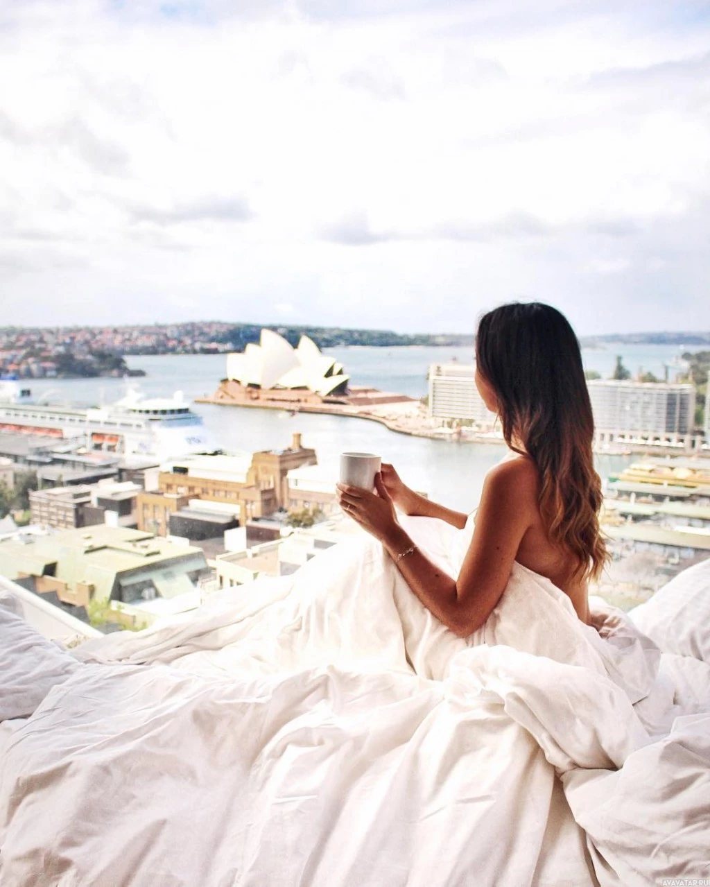 a cityscape view in the background. The individual is wearing a dress and has their back turned to the camera, so it's not possible to identify them by name. They are holding a cup that appears to contain liquid, possibly tea or coffee. The location suggests they might be at a hotel overlooking Sydney Harbour in Australia, given the iconic Sydney