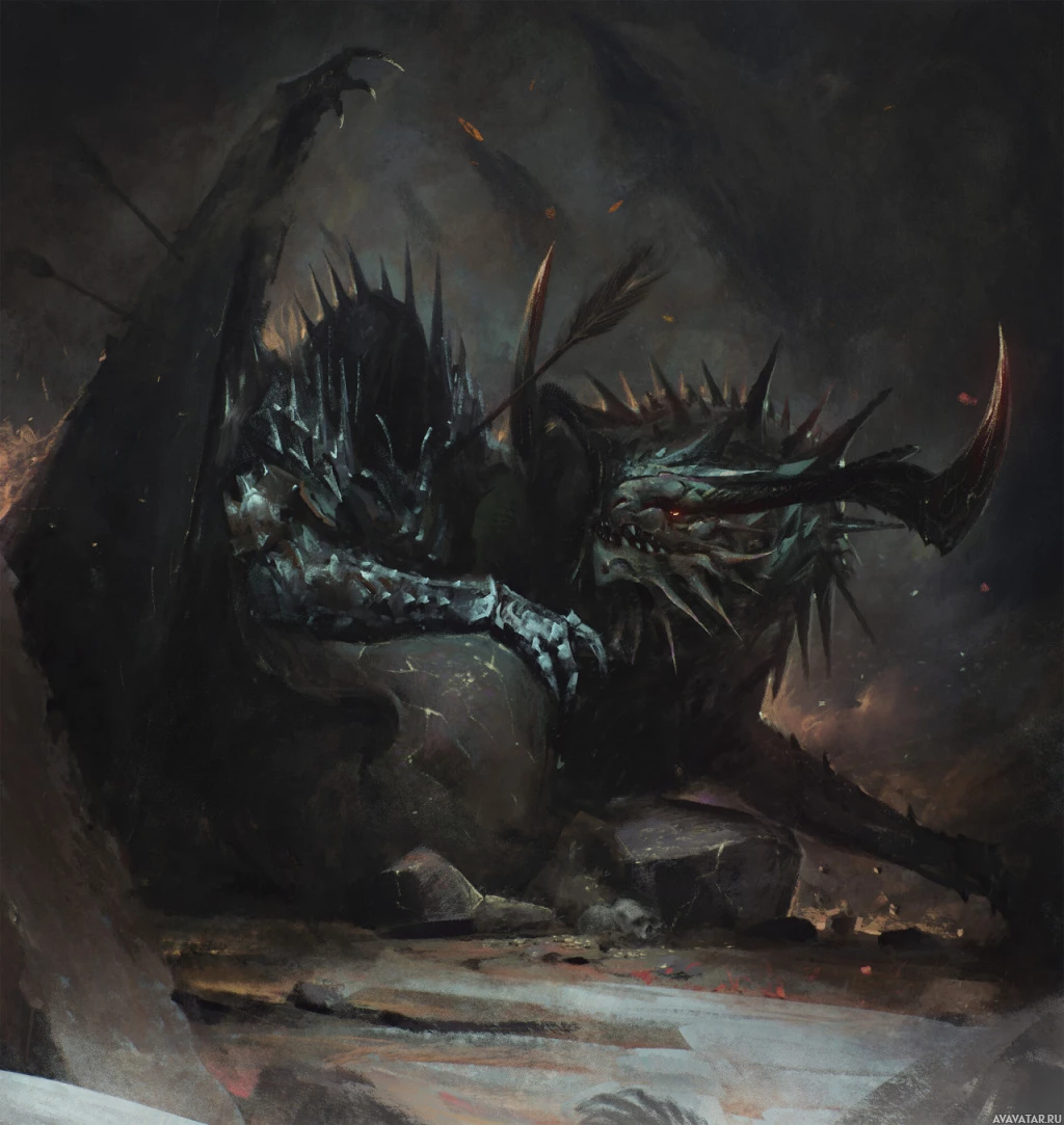 a fantasy scene featuring a large, menacing dragon with spiky armor and red eyes. It is positioned on what appears to be