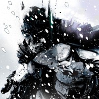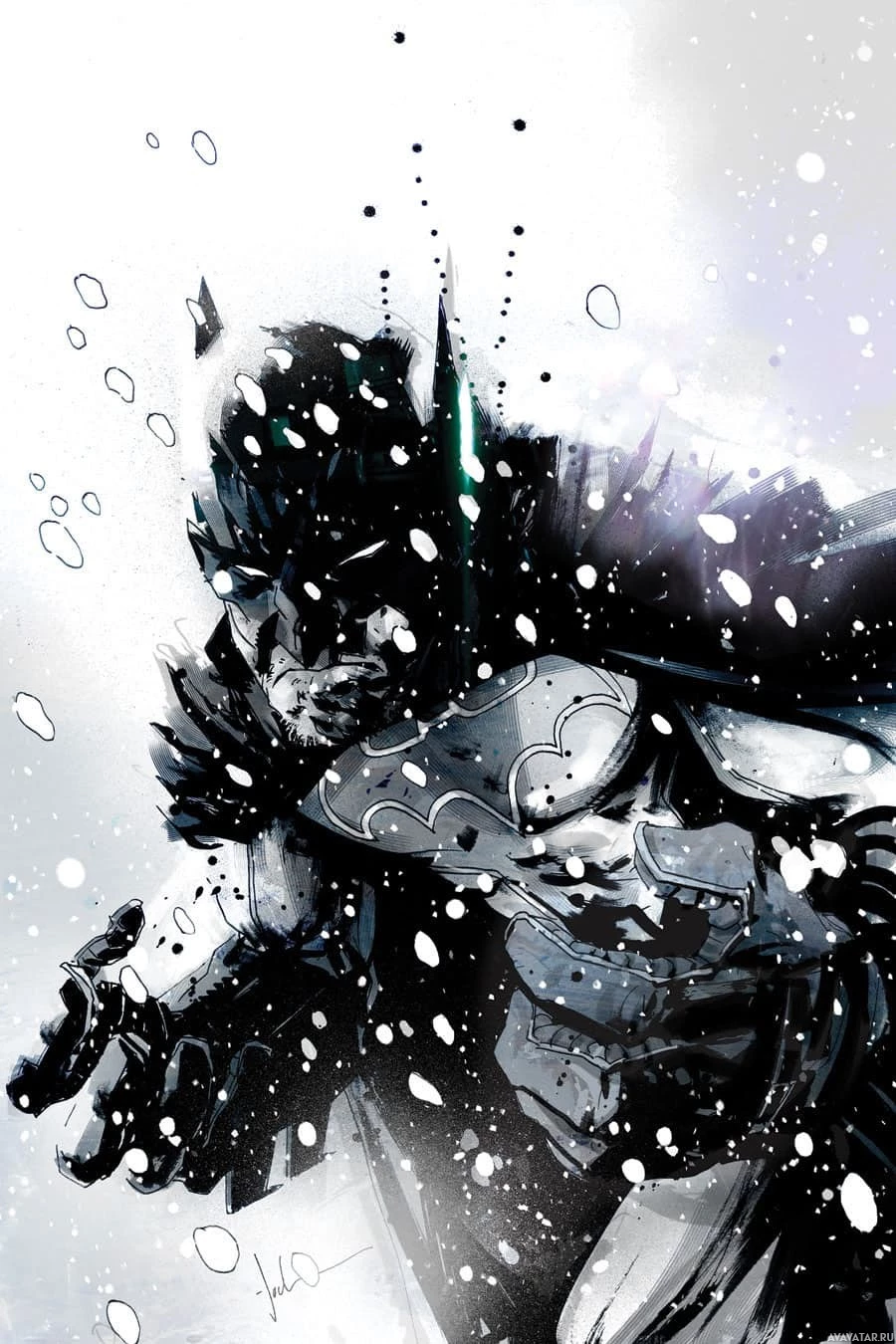 bat emblem and gripping what looks like a weapon, possibly a gun or a batarang. There's a sense of movement and urgency conveyed by the dynamic posing and the snow flurries around him, suggesting that he might be in