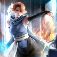 a female character with red hair, set in what appears to be a fantasy setting. She is wearing an outfit that seems inspired by traditional or historical attire, possibly suggesting a role within a story or game related to medieval or fantastical themes. The character has