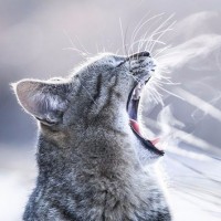 На картине изображена кошка с широко открытым ртом, как будто она зевает или, возможно, воет. Кошка, кажется, находится на открытом воздухе с высокой травой и тем, что выглядит как туман или туман, придавая изображению несколько эфирное качество. На этом изображении нет упоминания о какой-либо текстовой форме.