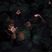 The image shows a person submerged in water, with their hands raised above the surface. The surrounding environment appears to be a body of water with lily pads and plants that resemble lotus flowers floating on its surface. There are no other discernable objects or landmarks in the immediate vicinity.