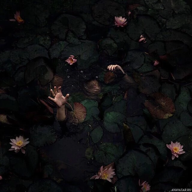 На снимке изображен человек, погруженный в воду, с поднятыми над поверхностью руками. Окружающая среда представляет собой водоем с лилийными подушечками и растениями, которые напоминают цветы лотоса, плавающие на его поверхности. В непосредственной близости нет других заметных объектов или ориентиров.