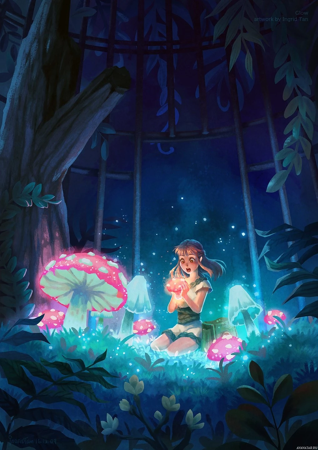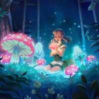 a small creature or animal in her hands. There are vibrant mushrooms growing around her, and the setting has