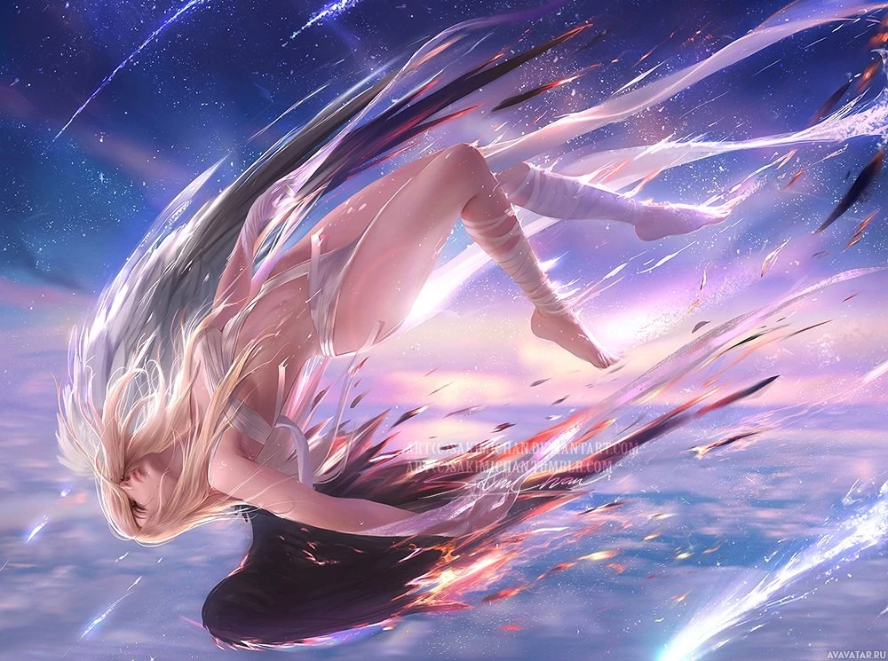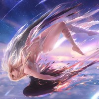an angelic figure. The character is shown in dynamic motion, with hair flowing behind them and a sense of movement suggested by