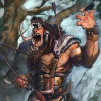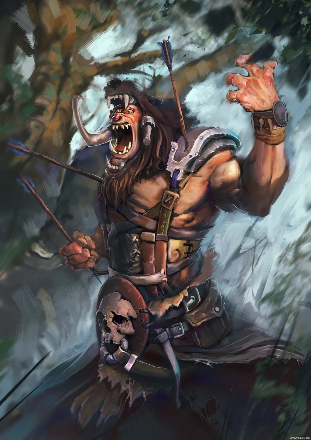Картинка показывает фэнтезийного персонажа, который кажется орком. Существо имеет мускулистое телосложение, с выдающимися бивнями и носит скобку на руке. Кажется, что он находится в боеготовой позиции с поднятой рукой, как будто готов нанести удар. Фон предполагает джунгли или лес с густой растительностью.