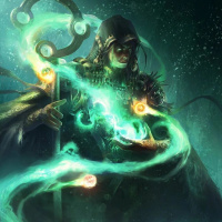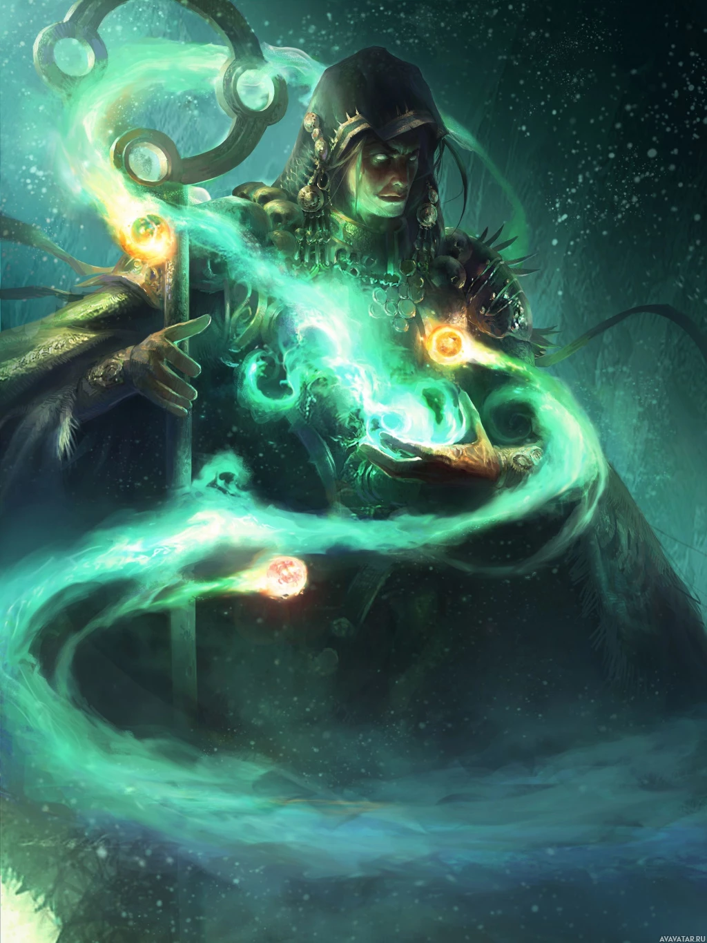 a fantasy character that appears to be a mage or magician. The individual is cloaked and hooded, suggesting they might be practicing magic or engaging in some