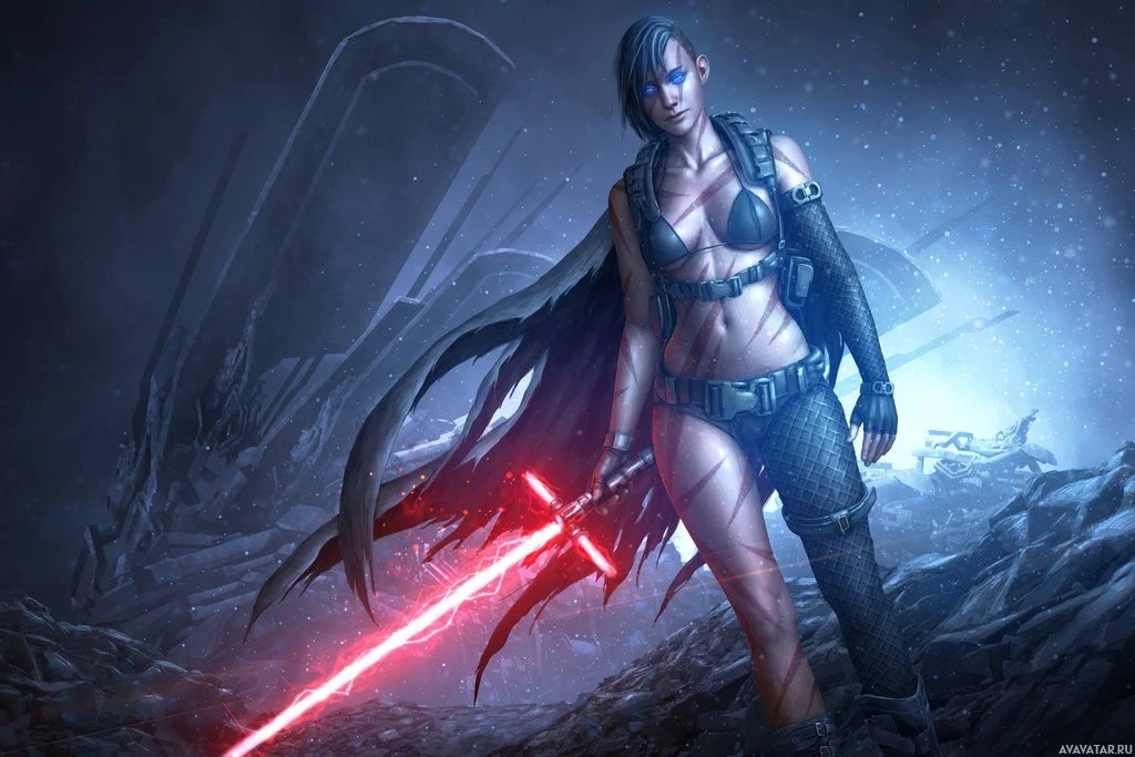 the Star Wars franchise known as Jedi or Sith depending on their alignment. The background features a dark and ominous environment, suggesting she may be in an adversarial setting within this