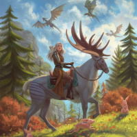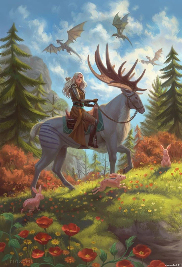 blonde hair, riding a unicorn through a forest setting. The elf is wearing traditional