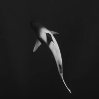 a shark swimming in the dark. It appears to be jumping or leaping out of the water, with its
