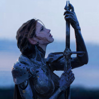armored knight, holding a sword and looking off into the distance. The attire appears to be made of