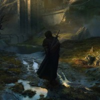 a fantasy scene where a character is seen from behind, holding what appears to be a sword. The character is dressed in