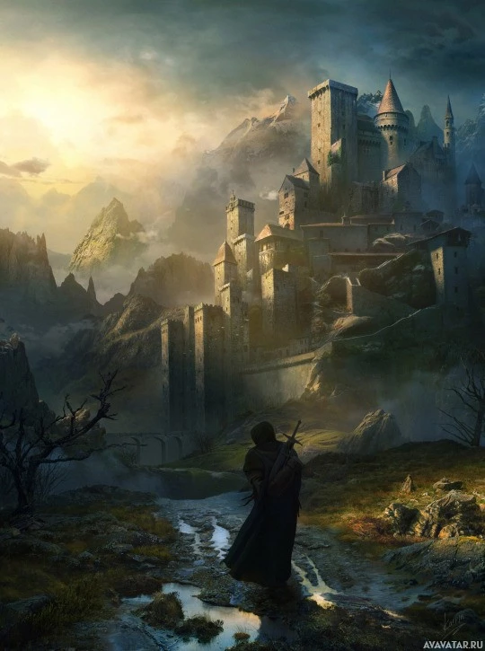 multiple towers and battlements, indicating a location possibly designed for defense. The sky is overcast, and there are hints of mist or fog in the scene, adding to