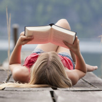 a young woman lying on her back and reading a book. She is wearing