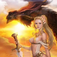 a large dragon depicted in a fierce pose, adding to the fantastical element of the scene. The artwork is detailed and colorful, showcasing elements typically associated with fantasy genres, such as armor, weapons, and