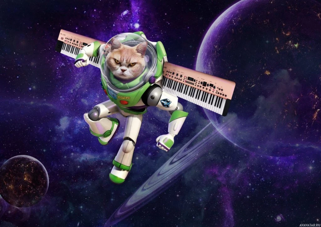 a space suit and helmet. The background is set against the backdrop of the cosmos, featuring stars and planets that are reminiscent of those found in