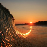 a beach scene at sunset. There is water with small waves approaching the shore, and