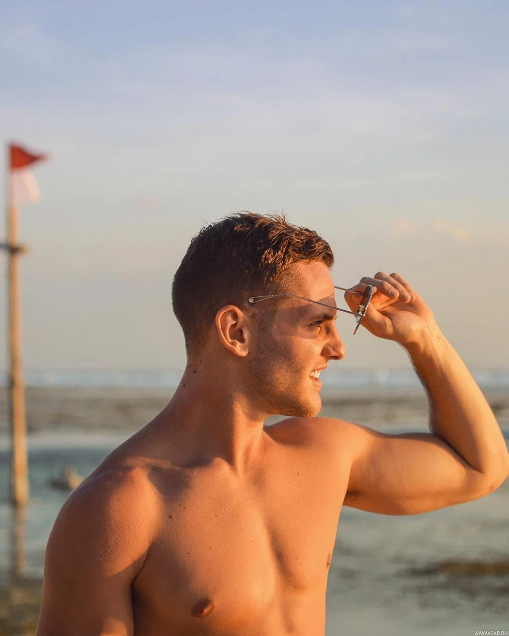 The image shows a man standing on what appears to be the beach or near water. He is shirtless, wearing sunglasses, and has his head tilted upwards with his hand shading his eyes as if he's squinting against the sunlight. The man seems to be enjoying himself, possibly during a break from swimming or other