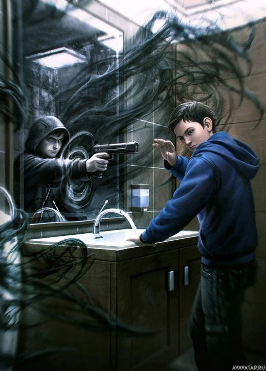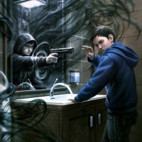 the reflection of the mirror, he sees an image of another boy pointing a gun at him. This creates