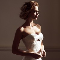 The image shows a woman standing elegantly. She is wearing a white, off-the-shoulder dress with