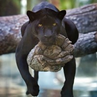 The image shows a black panther lying on its side with one paw resting on a tree branch. The panther appears relaxed and is in a natural environment, possibly in the wild or a well-designed habitat that mimics such an environment.