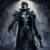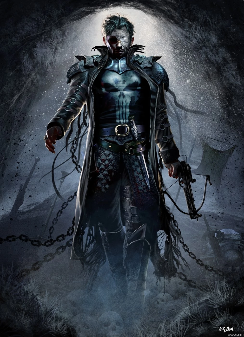 The image depicts a character wearing a cloak, holding a crossbow, and standing in what appears to be a dark and moody setting. The character is dressed in a costume that resembles a blend of superhero and fantasy elements, with chains visible on the lower part of the image. There's also a textured background that adds to