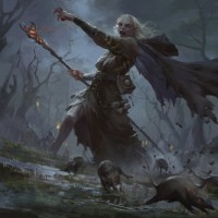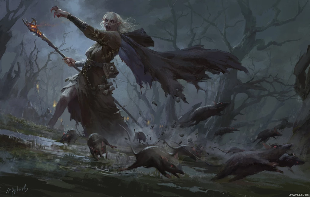 a fantasy scene where a witch, possibly an elderly woman with white hair and dressed in a robe with a hood, is interacting with a swarm of rats. The rats are flying around her, some closer to her face than others, which gives the impression that she might be using magic or control over these creatures. The setting appears to be a forested area at night or under moonlight, as indicated by the dark and
