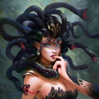 a fantasy character that appears to be Medusa, known as the Gorgon from mythology. She is portrayed with snake-like hair and