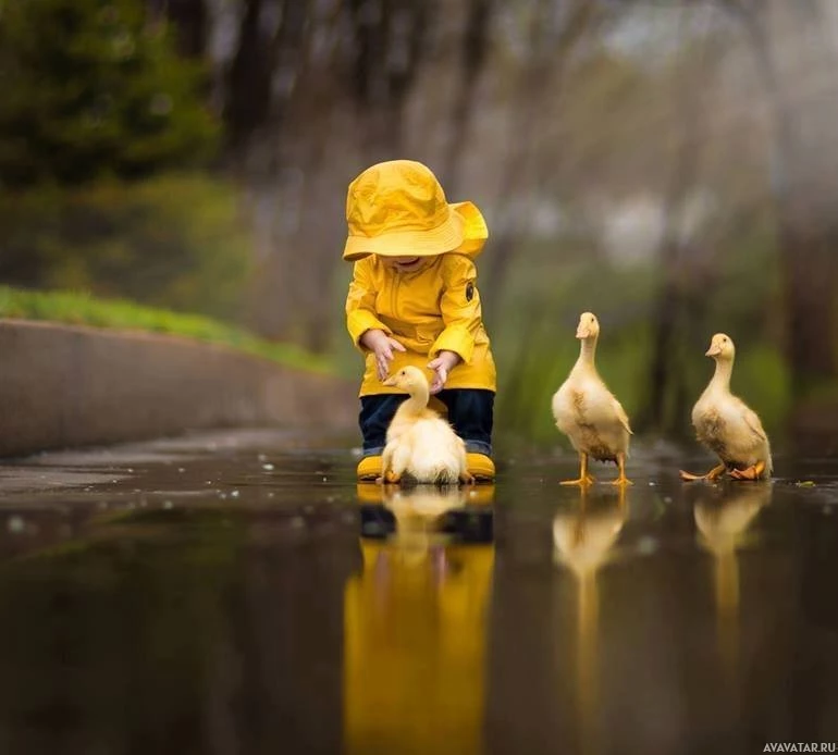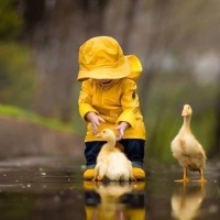 a yellow raincoat and boots, crouching down to interact with three ducklings. The ducklings are standing on the pavement and appear to be pecking or sniffing at the child's hand. This scene takes place in a setting that looks like a park during