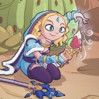 a young woman with blonde hair, wearing armor and holding a staff that is also part of her outfit. She appears to be interacting with some sort of magical or enchanted