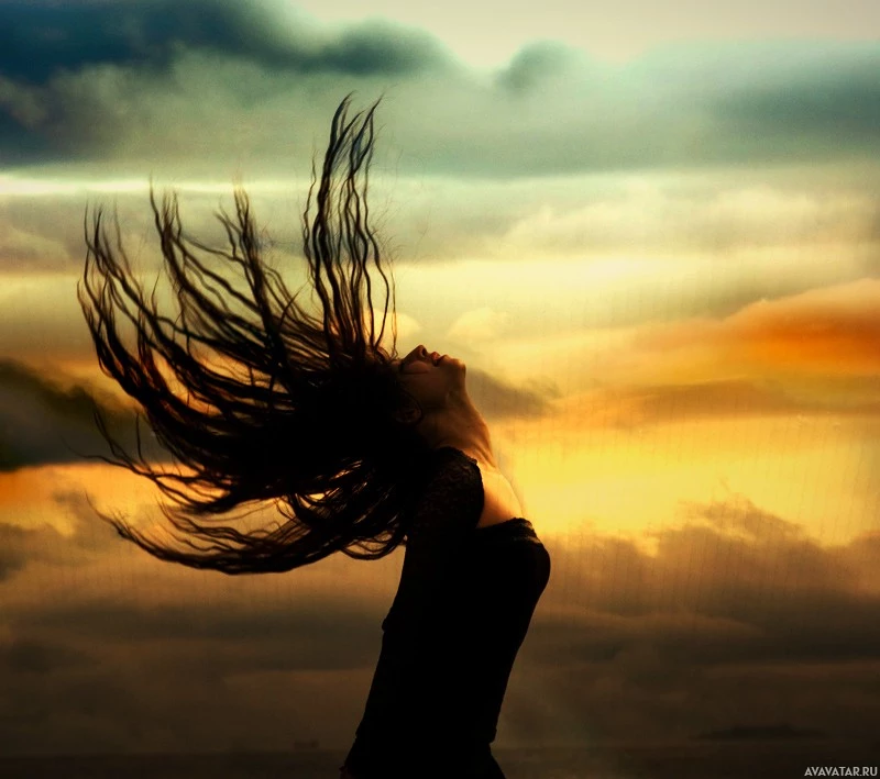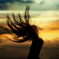 flowing hair. She appears to be in an open