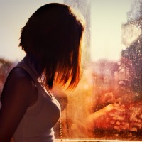 In the picture, there is a woman looking out of a window with her head tilted down. The sunlight appears to be streaming through the window, creating a warm and bright atmosphere. She has short