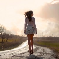 loose waves, which suggests movement as if she is in motion. The road looks muddy or wet, indicating
