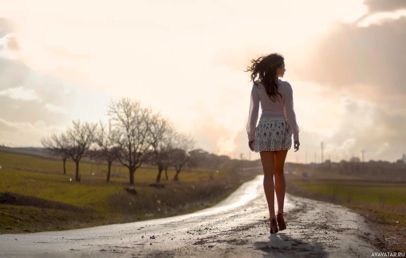 The image features a woman walking away from the camera on what appears to be