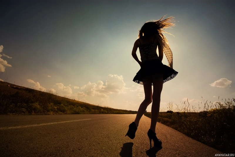 На картинке изображен силуэт девушки, бегущей по дороге с заходом солнца или поднимающейся на заднем плане, создающей драматический эффект. По бокам дороги видны облака и трава, что говорит о том, что это может быть сельская местность или открытая автомагистраль.