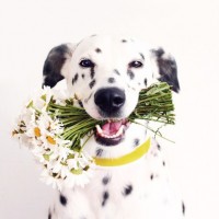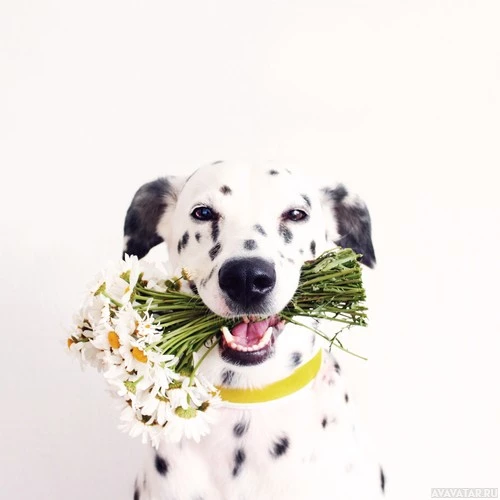 На снимке изображена далматинская собака, держащая во рту букет цветов. Собака выглядит счастливой и смотрит прямо в камеру с широко открытыми глазами, возможно, улыбаясь или задыхаясь от волнения. В букете есть ромашки, которые держит собака, что добавляет праздничное прикосновение к сцене.
