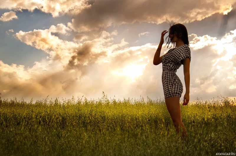 an open field with tall grass. They appear to be facing away from the viewer, looking towards the sky which is partly cloudy and illuminated by what seems to be sunlight, possibly during sunrise or sunset. The individual is dressed in